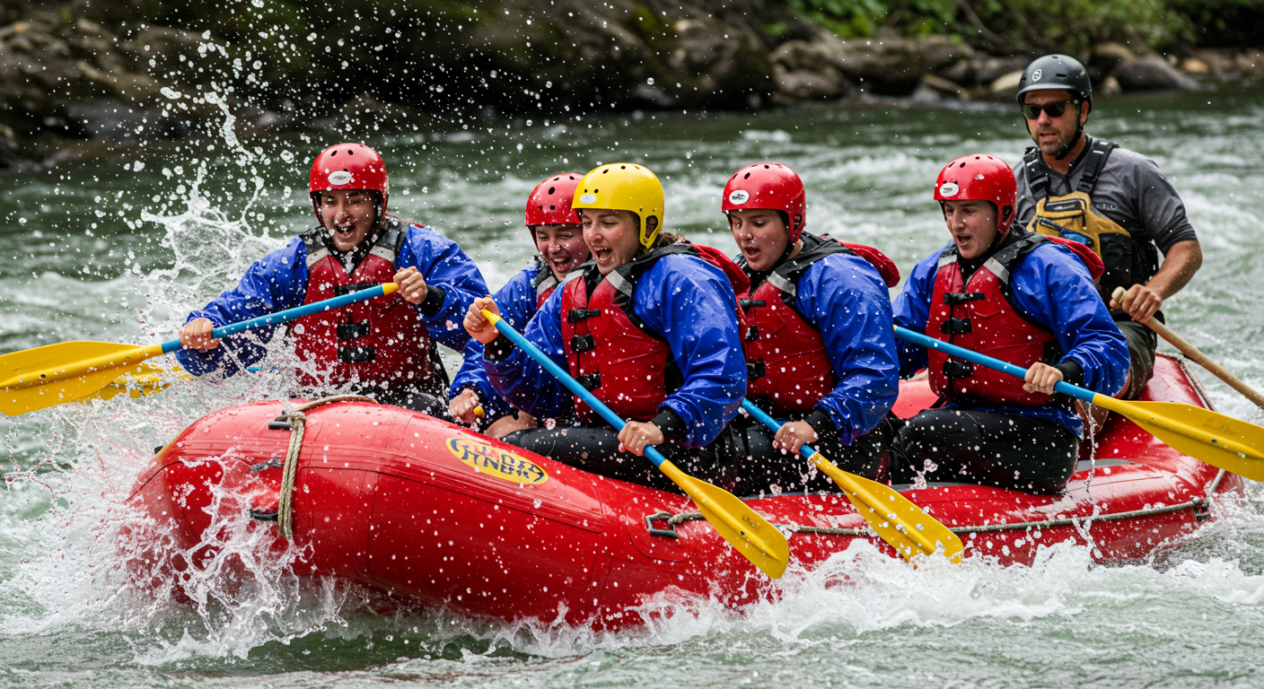 Janice (sitting in the back) is enjoying the white water rafting in Denali, Alaska
